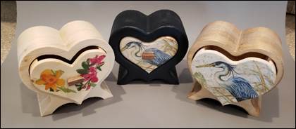 More New Toys...So... This month we made up 3 samples of some simple Bandsaw Boxes just to see if there would be any interest at the Hometown Market. We also tried a new technique (at least it's new for us), and that was to include a decoupage finish. Thinking ahead of Valentines Day, we made them in the shape of a heart. Well,.. They sold really quickly. So now we’re in a mad rush to make a bunch more boxes since our next visit to the Hometown Market at Brownwood will be Valentines Day Feb 14th.